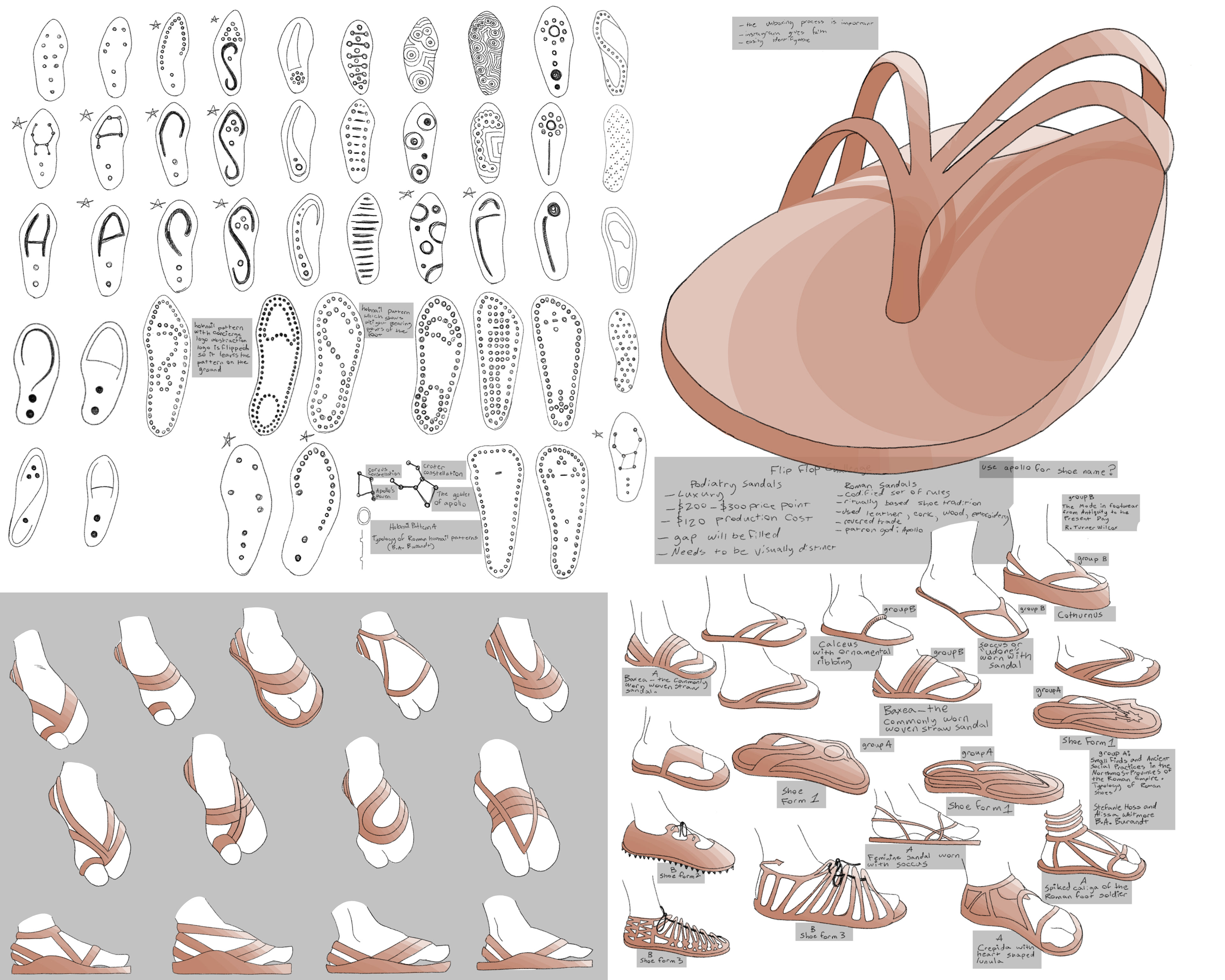 A set of sandals which seeks to blend archaeological finds with moder manufacturing methods
